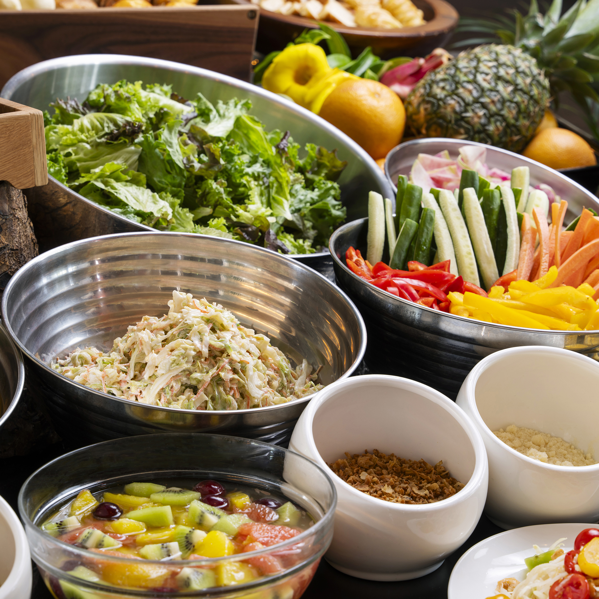 旅の朝は、新鮮な島の恵みで身体を目覚めさせて。豊富なトッピングが並ぶサラダバーでは、ドライマンゴーやパンプキンシード、ベーコンフレークなどを自由に組み合わせて、あなただけのパワーサラダが作れます。ピパーチやシークワーサーなど、島ならではの調味料もぜひお試しください。
