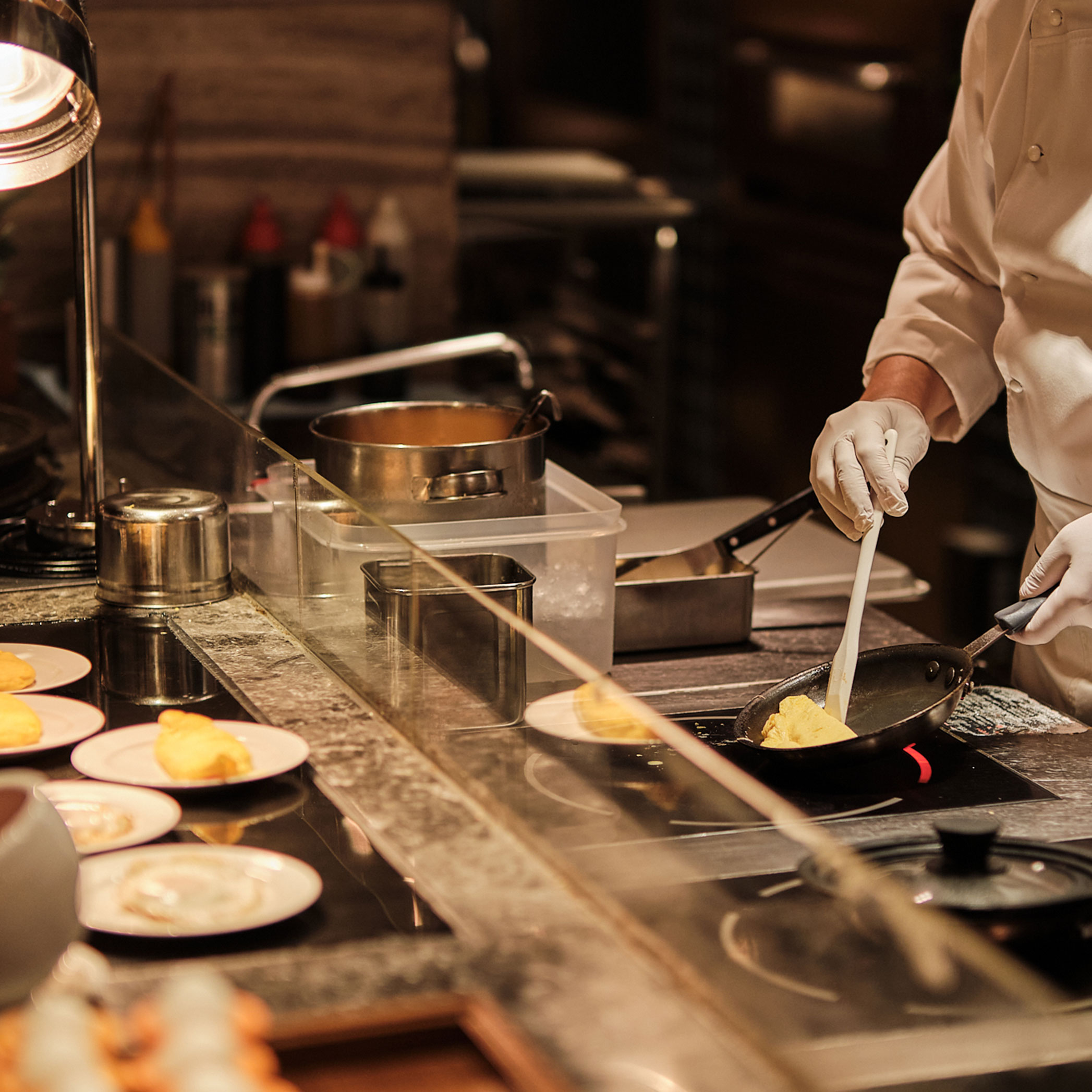 シェフが目の前で腕を振るうライブキッチン。